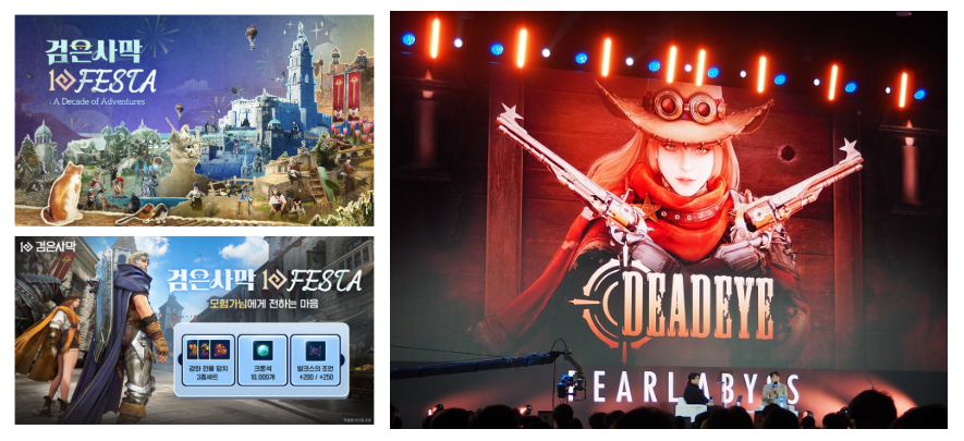 펄어비스는 12월 14일 수원 메쎄에서 500여 명의 한국 및 글로벌 모험가들과 함께 ‘검은사막 페스타: 10년의 모험’을 개최했다. 이 자리에서, 향후 업데이트 콘텐츠와 ‘데드아이’라는 신규 캐릭터와 시즌 서버 개편 소식이 공개되었으며, 이를 통해 모험가들의 기대감을 더욱 키웠다. 또한, 특별한 능력을 지닌 ‘꿈결 환상마’를 모든 모험가에게 선물로 제공하고, 12월 24일에는 데드아이라는 총을 사용하는 신규 클래스가 공개될 예정이다. 이 클래스는 많은 모험가들이 기다려온 캐릭터로, 12월 24일 업데이트를 통해 전 세계 모험가에게 선보여진다.