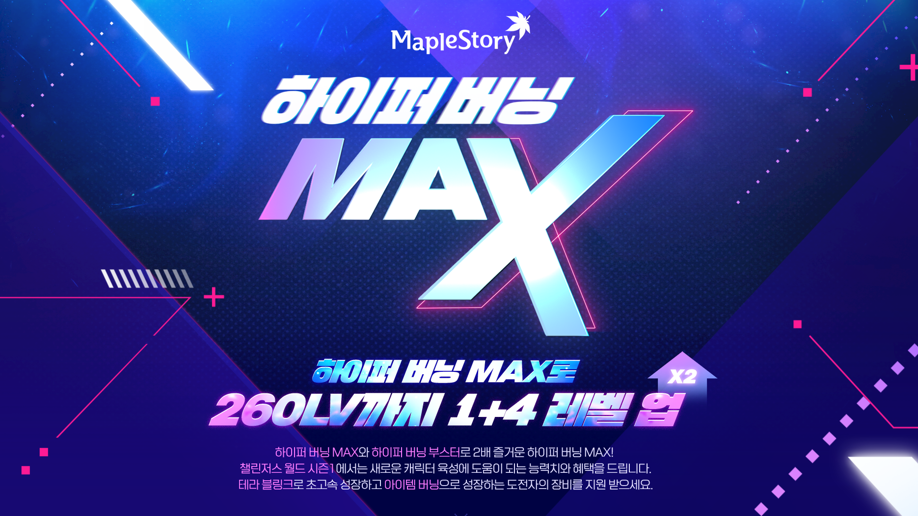 하이퍼 버닝 MAX 이벤트는 2025년 3월 19일까지 진행되며, ‘하이퍼 버닝’ 혜택을 더욱 강화한 1+4 레벨업 시스템을 제공한다. 적용 시, 캐릭터는 260레벨까지 빠르게 성장할 수 있으며, 각 레벨 구간마다 풍성한 아이템을 보상으로 제공한다. 또한, ‘아이템 버닝’ 이벤트도 함께 진행되어 장비 아이템을 빠르게 성장시킬 수 있다.
